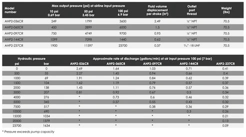 Infinitely variable output pressure and fluid displacement speed. Integral inlet air filtration and lubrication unit with air pressure gauge. Airline regulator for easy setting of input air and output hydraulic pressure. Maximum air consumption of 56 scfm (1.59 m3) per minute at 100 psi.