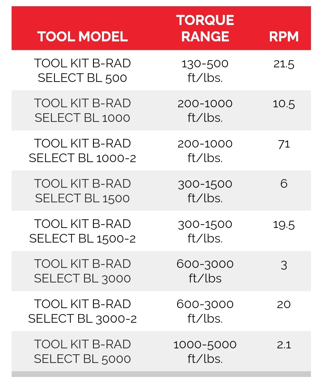 The new B-RAD Select BL battery series torque wrenches come with two simple buttons to increase or decrease the value by 10 ft. lbs. At the four-digit display, the set torque value is displayed. The B-RAD Select BL series automatically backs off when the torque cycle is complete, this allows for the end user to move quickly to the next bolt.