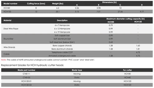 High quality tool steel cutting blades. Fitted with quick connect coupling for easy connection to hydraulic pump & hose. Suitable for cutting copper, aluminum and telephone cables.