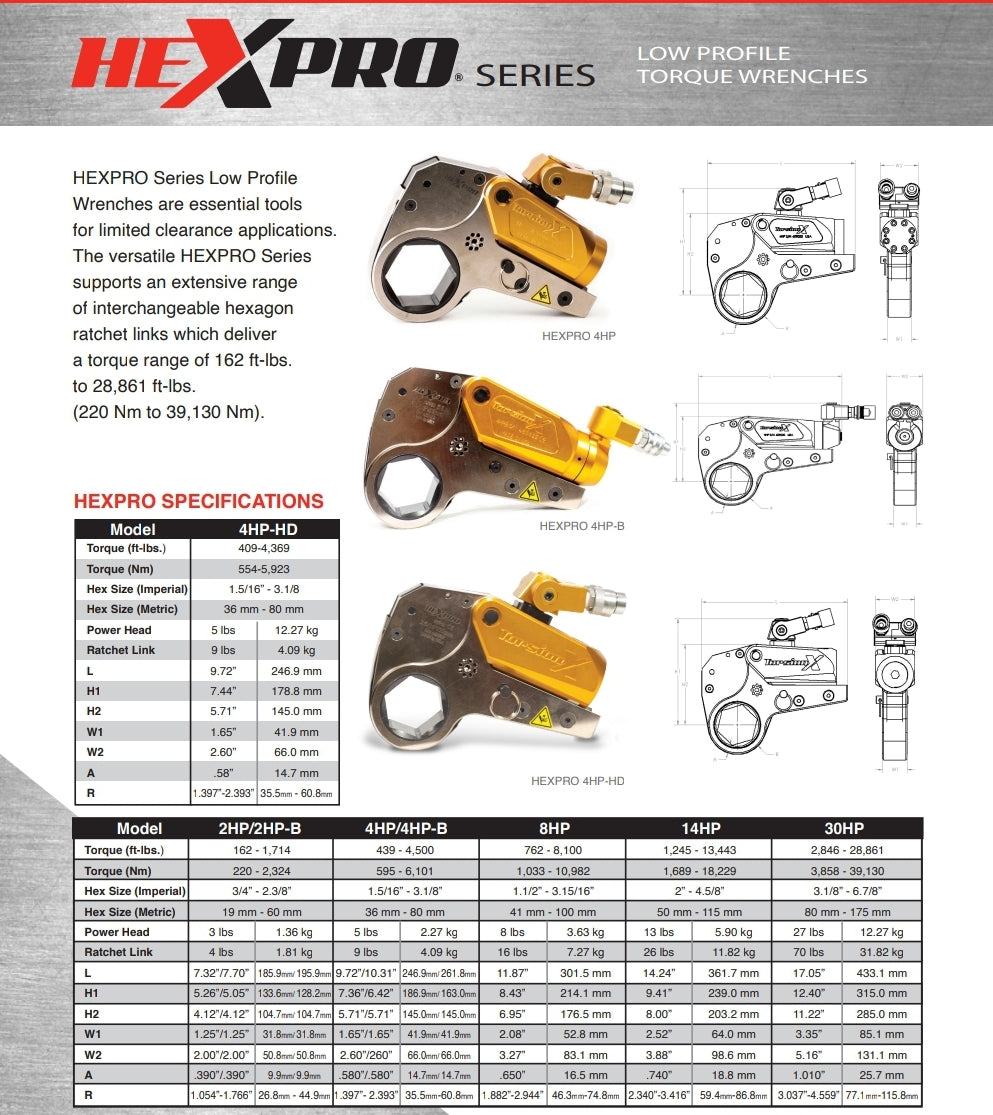 The versatile HEXPRO Series Hydraulic Torque Wrench supports an extensive range of interchangeable hexagon ratchet links that deliver a torque range of 162 ft-lbs to 28,861 ft-lbs (220 Nm to 39,130 Nm).