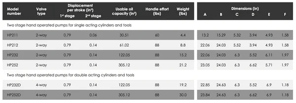 Oil reservoir capacity up to 305.12 cubic inches. Lightweight aluminum construction with external pressure release valve and factory set safety relief valve. Changeover pressure is 203 psi. Low handle effort and ergonomic grip for easy operation.