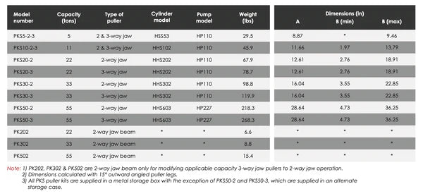 Note: PK202, PK302 & PK502 are 2-way jaw beam only for modifying applicable capacity 3-way jaw pullers to 2-way jaw operation.