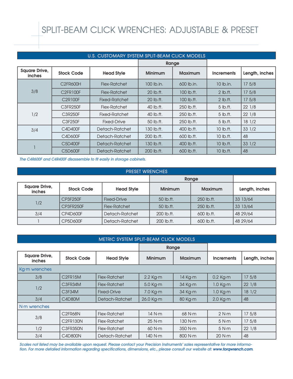 Available in 3/8" to 1" drive and 100 in/lbs to 600 ft/lbs with or without breaker bar