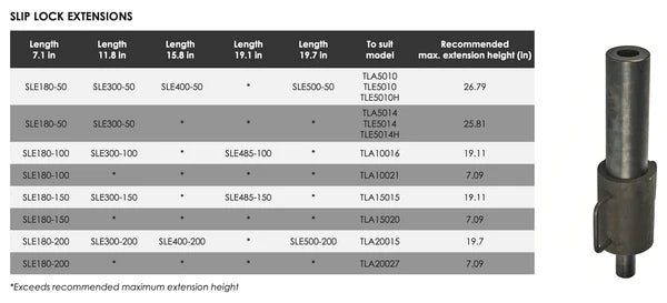 Slip lock extensions can be used in multiples up to the maximum height as specified in the table.